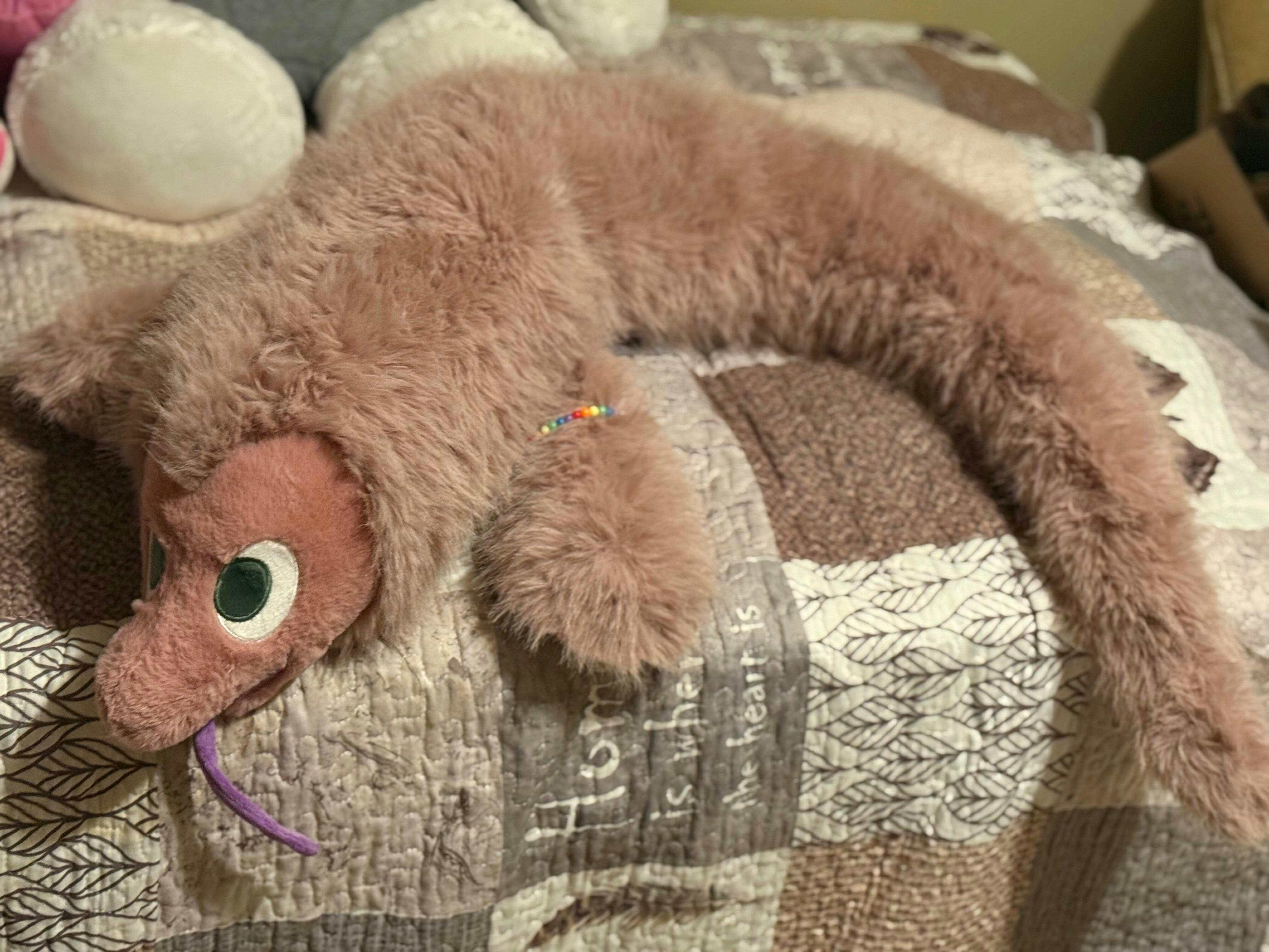 The wire tongue feels really secure and won’t fall out. The fur texture is divine and not usually found on other plushies. It’s like a double layer fur coat. Divine and soft. Not likely to matte up easily. The paws are adorable and I love the unique design. A very large and long plush. Great value for money!